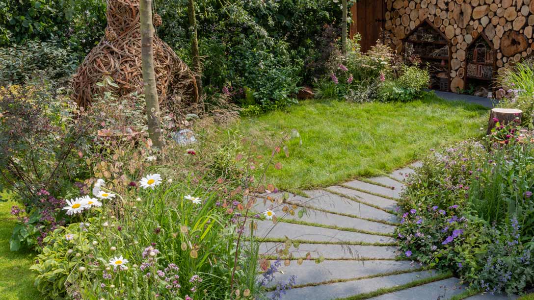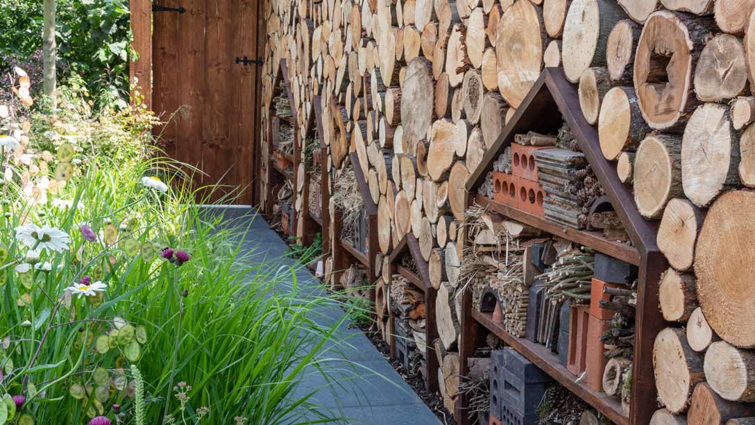 - The two boundaries created by native mix hedging and a striking habitat wall, containing bricks and logs, provide food and shelter for garden creatures
