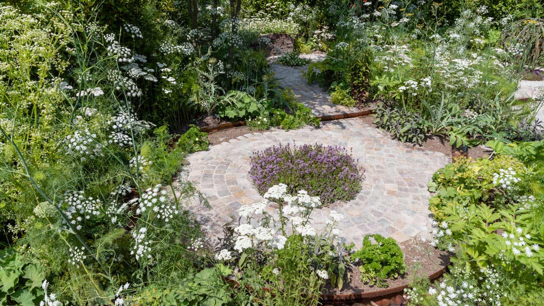 The layout of the garden is denominated by the path’s route, which loops and circles to contain a circular water trough and round of thyme. Hazy structure is provided by plants such as ammi and valerian while creeping thyme and camomile feature as delicately scented low-growing elements.