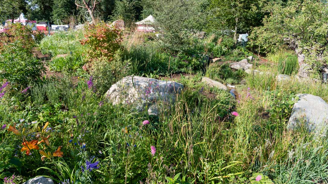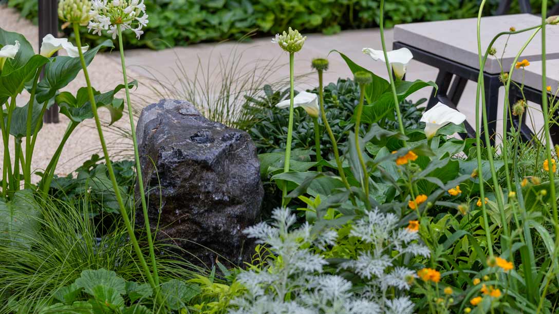 - The mostly white and green colour palette of the planting is soft and calm, and was designed to have a jungle-like feel with plenty of lush foliage. A few pops of orange are dotted around the space, including geums and Eremurus