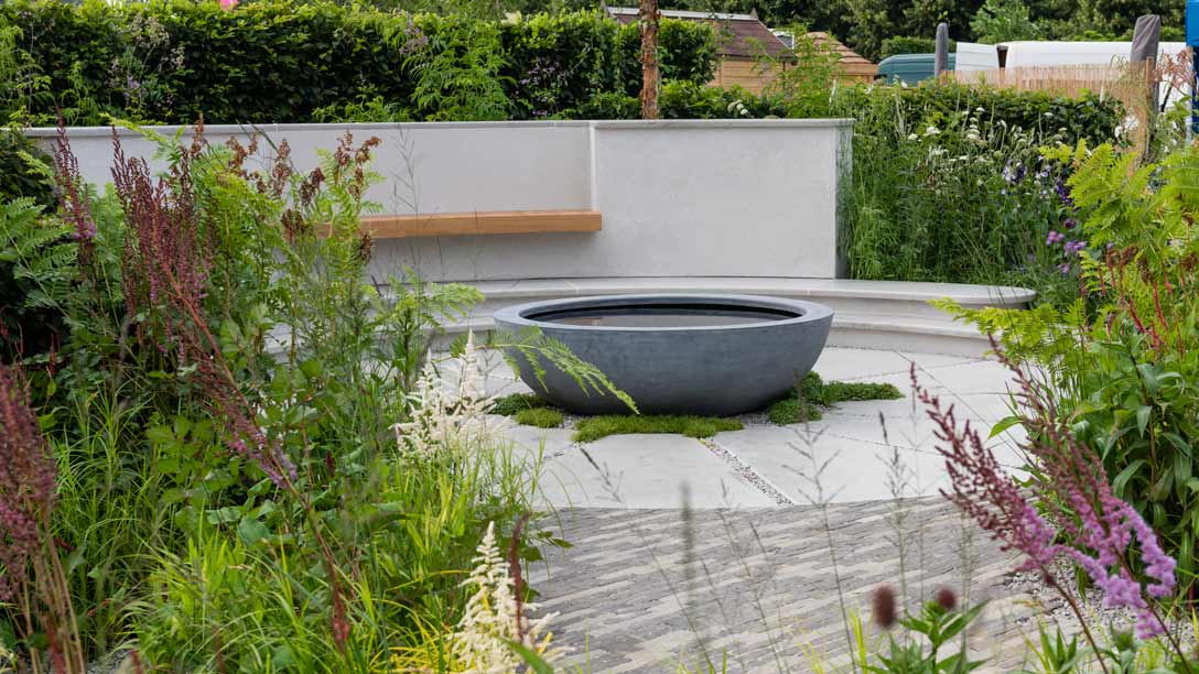 The garden’s fluid curves flow towards a central, circular terrace and water feature. Rainwater is managed by a rain garden that follows the shape of the path leading off the terrace. Permeable paving on the path and terrace helps reduce water run-off from the garden's hard surfaces. Flood-tolerant planting has been selected, as well as a mix of perennials and grasses that are best suited to well-drained soils and drier conditions.