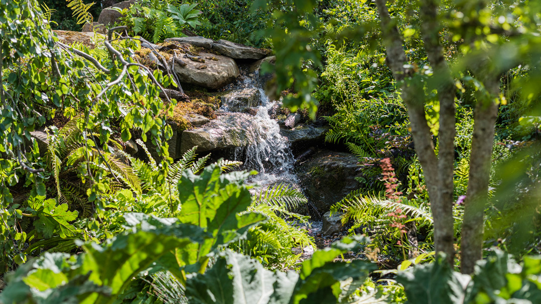 The design is inspired by the original RHS Chelsea garden with many of the key features such as the waterfall, dens and hollow log returning, alongside new elements including a wildflower meadow, rolling hill and summer planting.