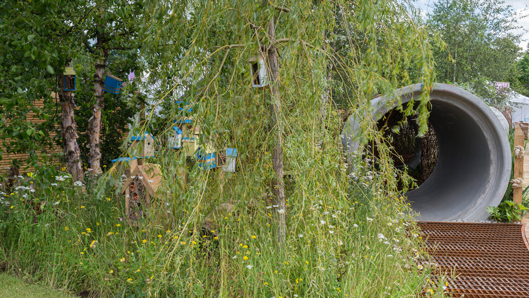 The garden contains three main planting areas: drought-tolerant with Eryngium giganteum and Agave americana; moisture-loving featuring Caltha palustris and Lythrum salicaria; and nectar-rich wildflowers with bug and bird boxes set among woodland trees to encourage wildlife.