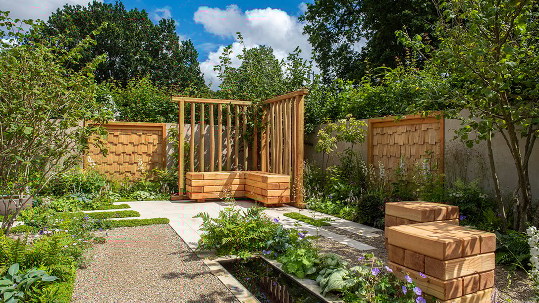 The wooden screen, made of Sussex-grown sweet chestnut, allows a view to the woodland planting while still offering sanctuary. Water sits alongside areas of planting providing a calming effect.