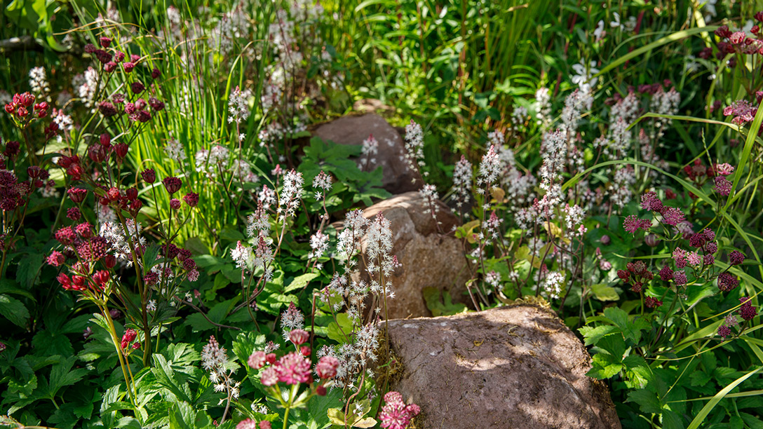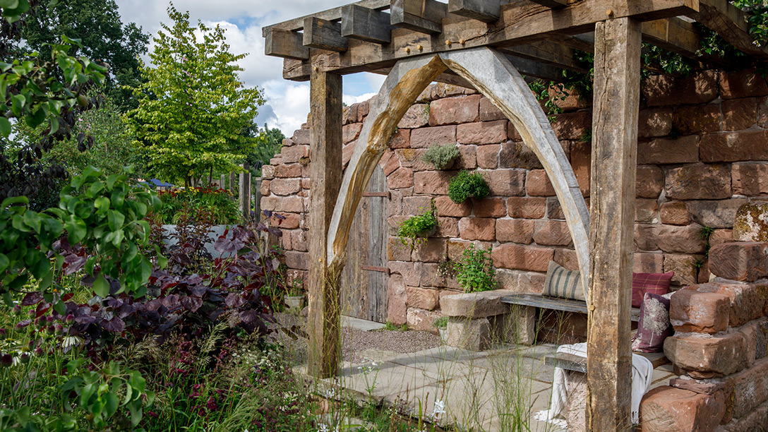 This garden is designed to inspire visitors with its sense of romance and beautiful abandonment. A disused farm building has left its mark in this garden, leaving behind a stone wall with original features forming the backdrop to this repurposed space. A bespoke pergola built from reclaimed oak frames the family seating area, providing character, a sense of age and shade from the sun. The journey through the garden allows visitors to discover different viewpoints of the naturalistic planting with unintentional pockets and the architectural forms of the trees, stone and wooden structure.