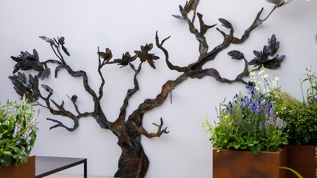 At the heart of the garden, a sculpture by Emma Rodgers, inspired by a mighty English oak, symbolises strength, wisdom and healing. It’s leaf canopy is made from hands applauding the NHS. Under a canopy of dappled shade, there are a selection of spaces to sit, pause, reflect and heal. Surrounding raised planters are filled with scented and textural plants in a blue and pale yellow colour scheme as a tribute to the NHS.