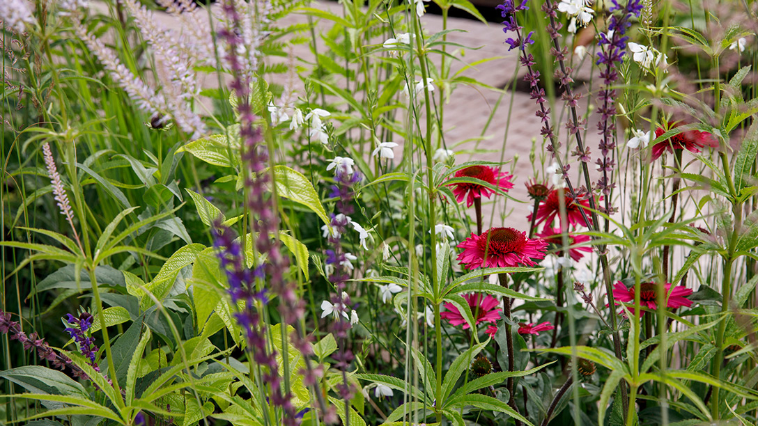 Generously planted borders offer a home for wildlife. The summer woodland planting includes Solomon’s seal, deciduous ferns, Euphorbia amygdaloides var. robbiae and dwarf lady’s mantle. Towards the front of the planting, summer perennials include Salvia nemorosa ‘Caradonna’, Agastache ‘Blackadder’, Geranium phaeum ‘Raven’ and Oenothera lindheimeri ‘Whirling Butterflies’.