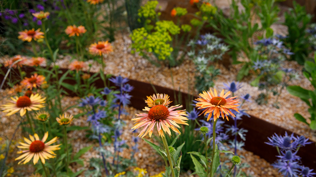 Inspired by this, the circular garden invites visitors to step ‘over the wall’ and enter an uplifting, joyful space. A winding path leads visitors towards a ‘sunrise’ circular opening in the wall, symbolising new possibilities. On the way, they pass vivid planting, which references the colours of the charity’s Brilliance Beads (awarded to children who attend OTW camps), and elements of Japanese aesthetic representing Takeda’s Japanese heritage.