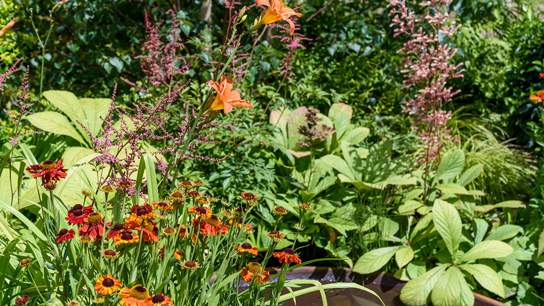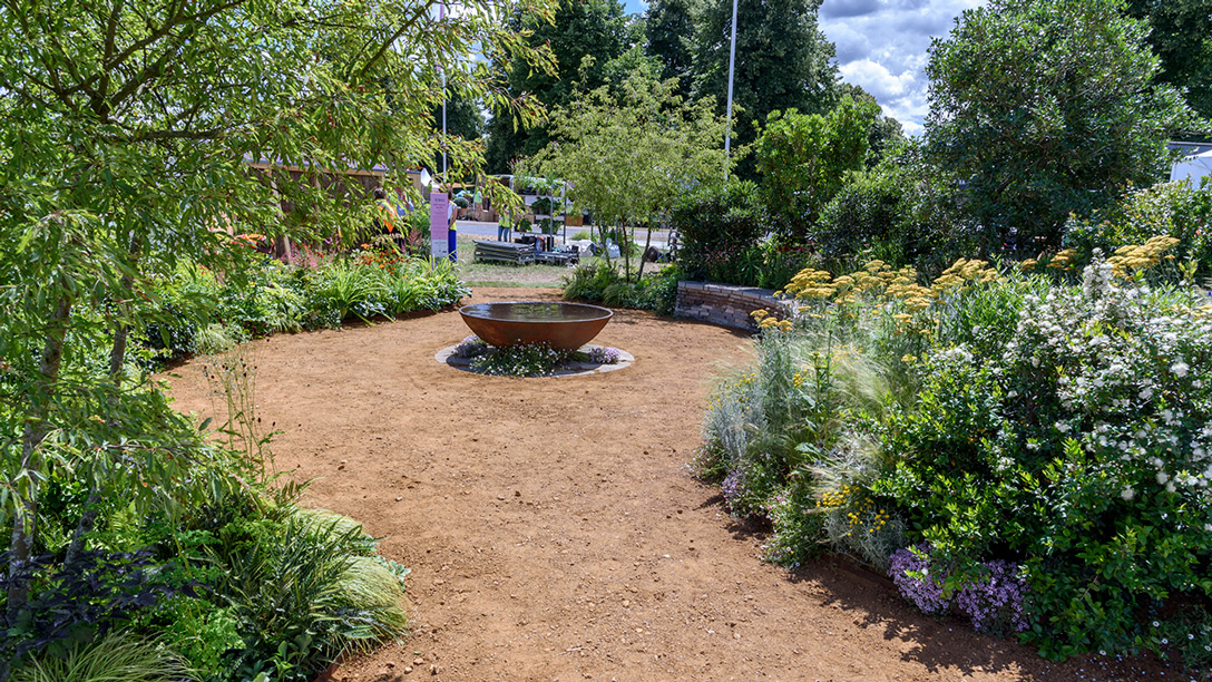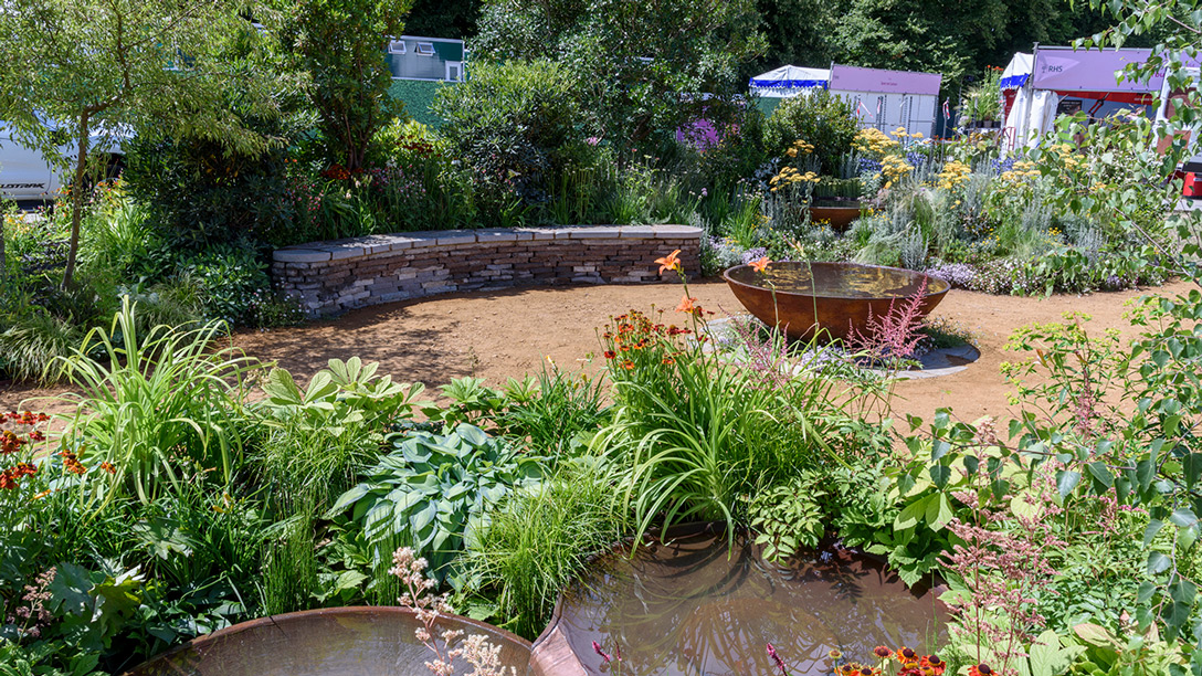 The RHS Planet-Friendly Garden explores innovative solutions for tackling climate change. The garden incorporates resilient and sustainable planting ideas for hot, dry slopes and sunken, wet marginal areas.