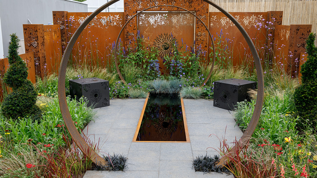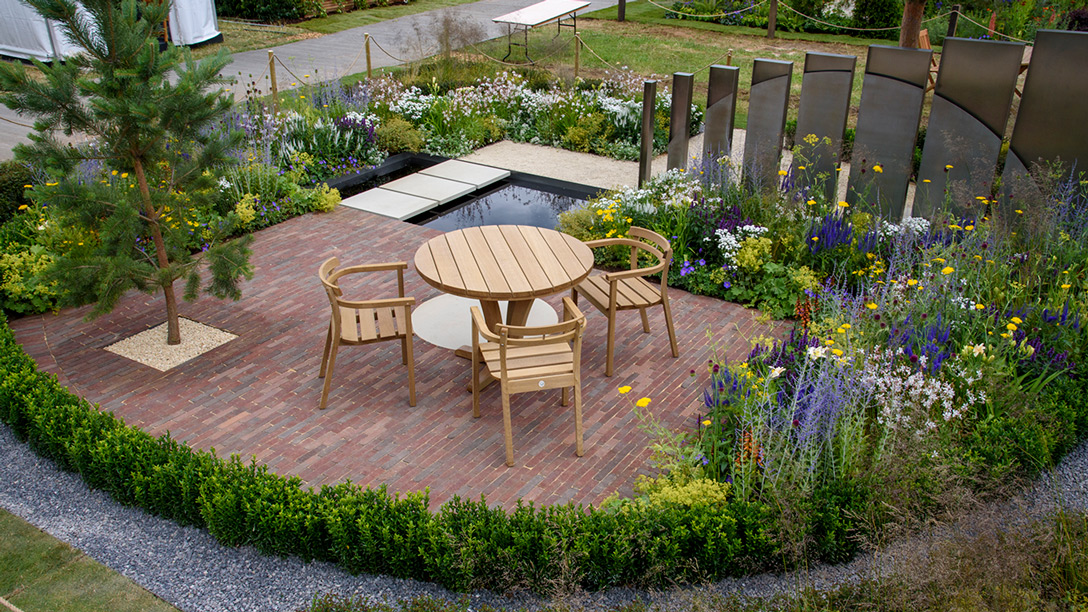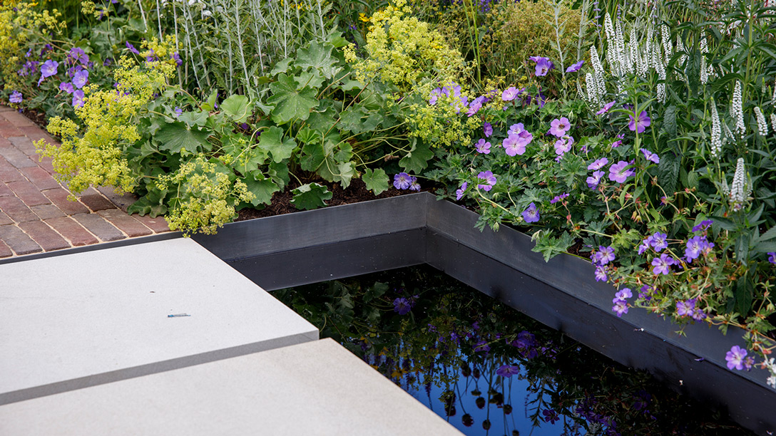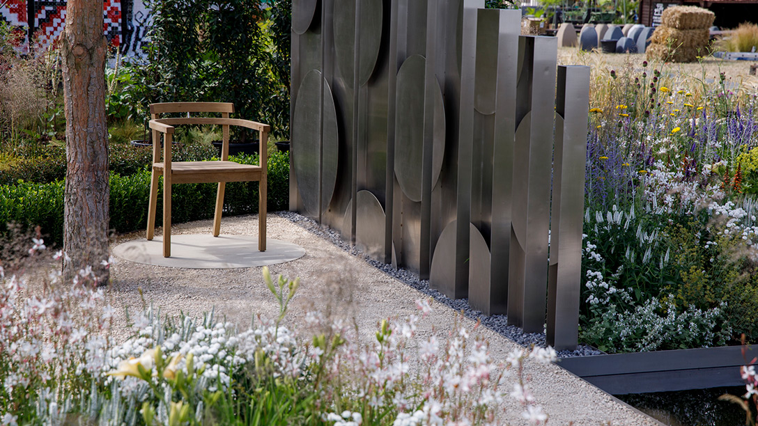 With a geometric design and materials chosen giving a nod to the setting of the Festival, the garden begins with an area separated from the rest by steel screens, representing social isolation. An evergreen pine tree signifies wisdom and longevity. From here, the planting scheme gradually becomes more colourful, encouraging exploration. A short path leads to a bridge across a pond – a journey that represents reflection and highlights the challenges of reconnecting with others.
