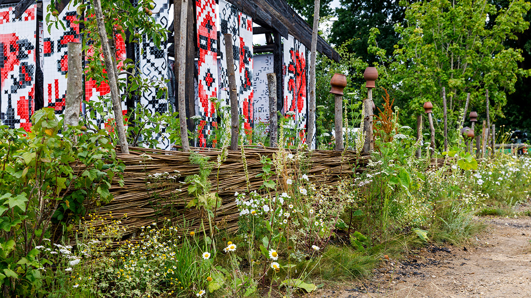 The garden is a distillation of the Ukrainian landscape and culture. It showcases the rushnyk, an embroidered cloth used in many rituals, as a symbol of life and identity. Like a new skin, rushnyks adorn the remains of a burnt cottage standing as a silhouette in the landscape – a field of barley interspersed with field weeds. Tucked inside the cottage, in the heart of the garden, is a tryzub sculpture as a symbol of rebirth.