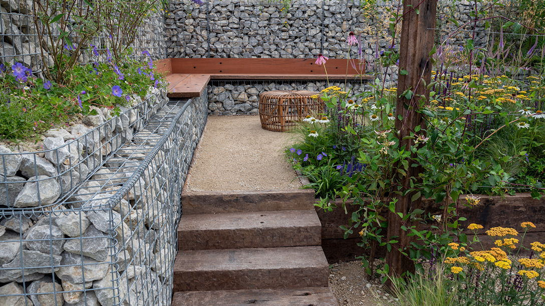 As well as reclaimed sleepers and scaffold boards, crushed stone is used for the seating areas and waste stone and waste materials are used make the gabions.