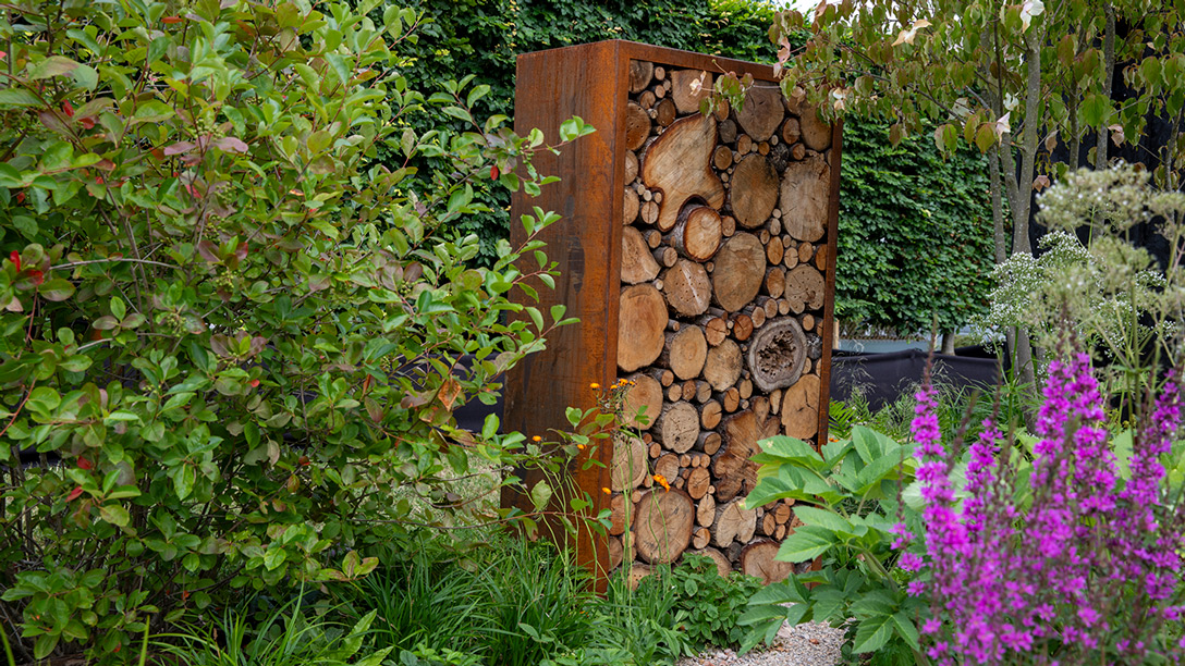 The rear garden is designed to be immersive and engaging, with a ‘food forest’ planting scheme to encourage a deeper connection with nature, and foster a creative and playful way to grow your own whilst also supporting wildlife. Plants include Aronia prunifolia ‘Nero’, Angelica gigas, liquorice, pomegranate and wild strawberry, with pops of colour from Lythrum virgatum ‘Dropmore Purple’ and yellow Hemerocallis.