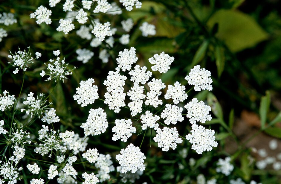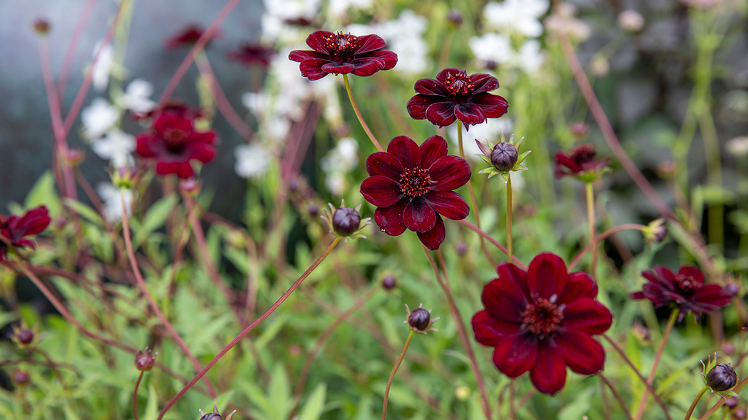 Whites, greens and dramatic dashes of deep purple and dusty pinks repeat through the planting, as does the varying flower forms – from the tall spires of Verbascum and Digitalis, to the domed umbels of Ammi and the pin cushion flowerheads of Scabiosa. Near the front of the garden, Cosmos atrosanguineus contrasts with Oenothera lindheimeri ‘Sparkle White’, offset by copper beech hedging.
