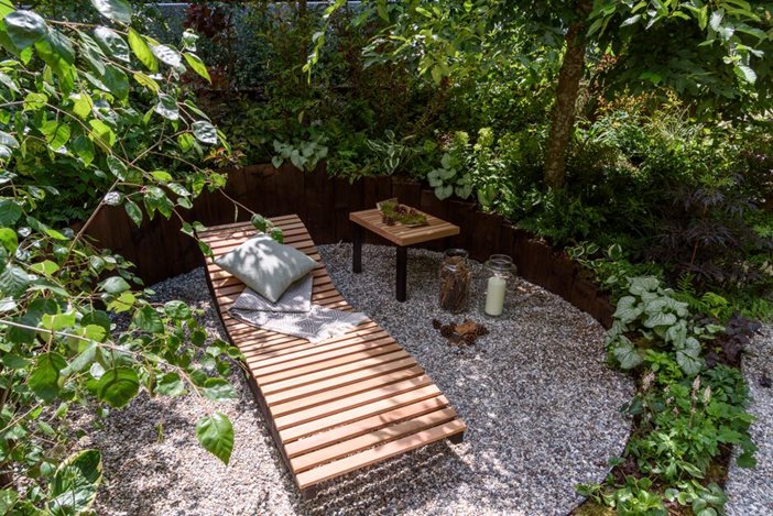 The Lunch Break Garden kept ideas simple incorporating straight lines and square planted areas, and a simple seating area surrounded by scented planting to offer a restful place to sit.
