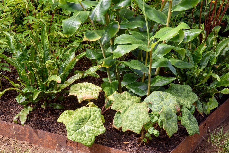Around every corner of this fascinating garden were delights to discover, such as the rare Podophyllum versipelle ‘Spotty Dotty’, seen here with ginger and an Asplenium fern.