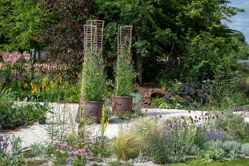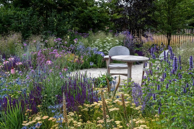 “From the hedge to the exit there’s a ‘meadow’, using a mix of herbaceous perennials and grasses that I would typically use in my own garden at Glebe Cottage. There’s three deep borders and a path leading to an oval seating area, surrounded by taller plants for a sense of intimacy, and a table with an inset herb planter.”