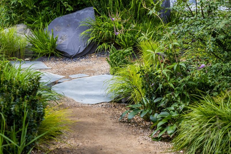 In the Cancer Research UK Legacy Garden by Paul Hervey-Brookes, gravel forms generous, sweeping paths blending gently down to a pond surrounded by lush hostas. Welsh slate is laid in the gravel in places, creating interest on the journey along the path. If you’re thinking of creating a new path at home, consider where it leads. Is there a focal point that draws you onwards or a place to sit when you arrive?