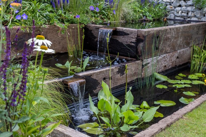 Creating height in the smallest of spaces makes a garden feel bigger and there is a wealth of ideas at the show. In the Nurturing Nature in the City garden, a pool of differing levels and water shoots is a wonderful feature. Created using reclaimed sleepers, which are easily laid, the pools are filled with water plants and bring wildlife in adundance.