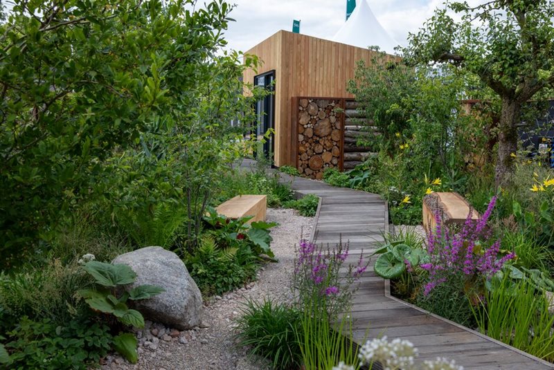 In Tom Massey’s RHS Resilient Garden, a reclaimed deck provides a raised walkway through the forest of food.