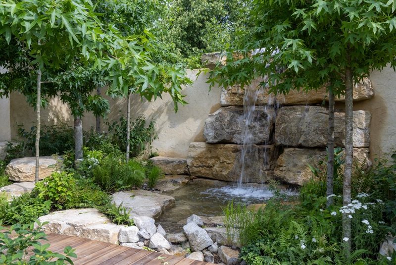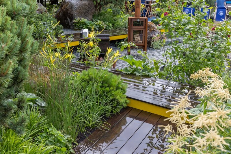 Decking made a mini-comeback with deckboard paths in several gardens. A zig-zag pathway made from recycled wood cuts an interesting shape through the Hurtigruten: The Relation-Ship Garden, allowing the space in between to be used as a seating area by the pool. In the America’s Wild garden, a greenheart deck stretches in front of the waterfall, its sandy tones blending beautifully with the Purbeck stone and wooden benches.