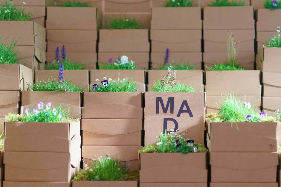 The headline sponsors of the show Mad About Land – Gardenwear pulled out all the stops for their installation. Cardboard boxes filled with mini-meadows, especially grown on the Madresfield Estate stacked up to create an Aztec garden, representative of urban structures such as the Trellick Tower in London, essentially a tessellated wildflower meadow. Each box in the tower is compostable and visitors on the last day of the show were asked to take a box home to reduce waste. Mad also created the incredible Arts and Crafts print floral projections that illuminated both their installation and the entrance lobby. Bob Sheard, co-founder of Mad About Land says: The projections are an homage to the urban architecture of Depot Mayfield. We believe the benefits of gardening should be available to everyone, and we can reap those benefits, not just from large spaces, but also from smaller gardens.