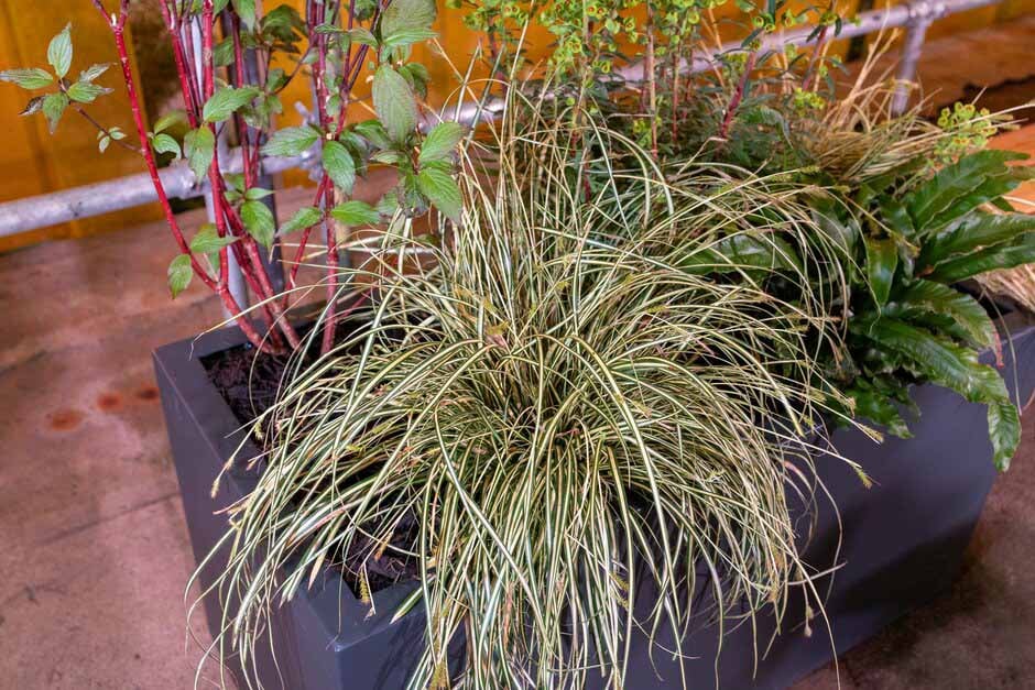 Emma Tipping, designer of the RHS MEN Pub Garden picked out Carex oshimensas ‘Evergold’ as her favourite on the garden. As underplanting to dogwoods and euphorbias, providing a splash of light among deep green ferns. Reliable and hardy it’s a hardworking evergreen sedge with plenty of year-round interest.
