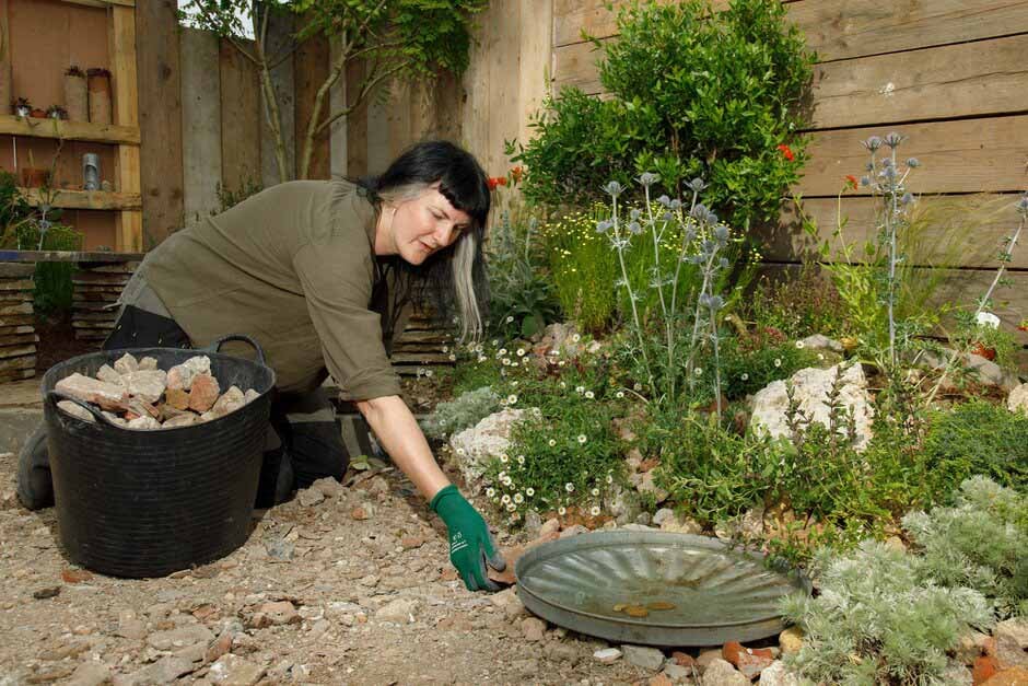 - Easily sourced or reclaimed materials to add interest to planting. Showing you don’t need to spend lots of money or time.