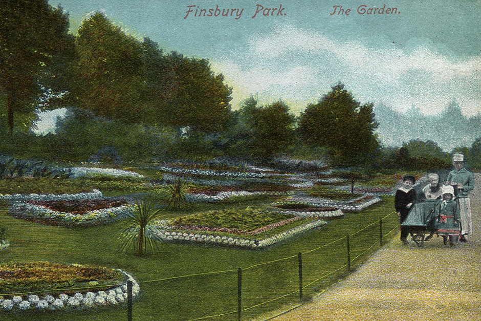 Image: [partial view] Coloured postcard of Finsbury Park with a family group, 22 February 1906. RHS Lindley Collections.