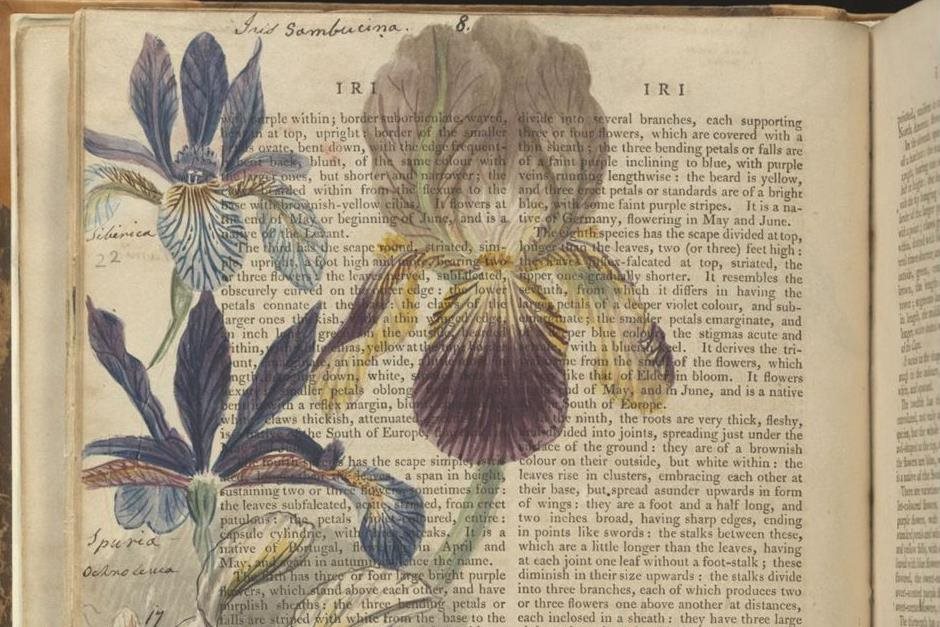 Peek between the pages of the RHS Lindley Library's unique copy of the McDonald Dictionary, decorated in hand painted botanical watercolours.