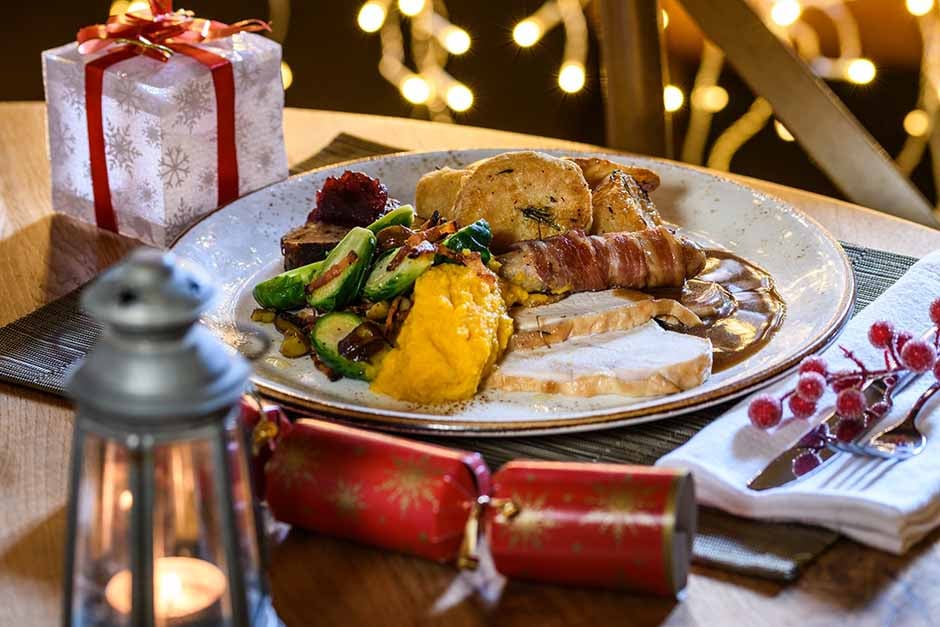 Roast Turkey with Hyde Hall Stuffing, Pig in Blanket, Roast Potatoes, Honey Roast Parsnips, Braised Red Cabbage, Brussel Sprouts with Smoked Bacon & Chestnuts and Turkey Gravy
