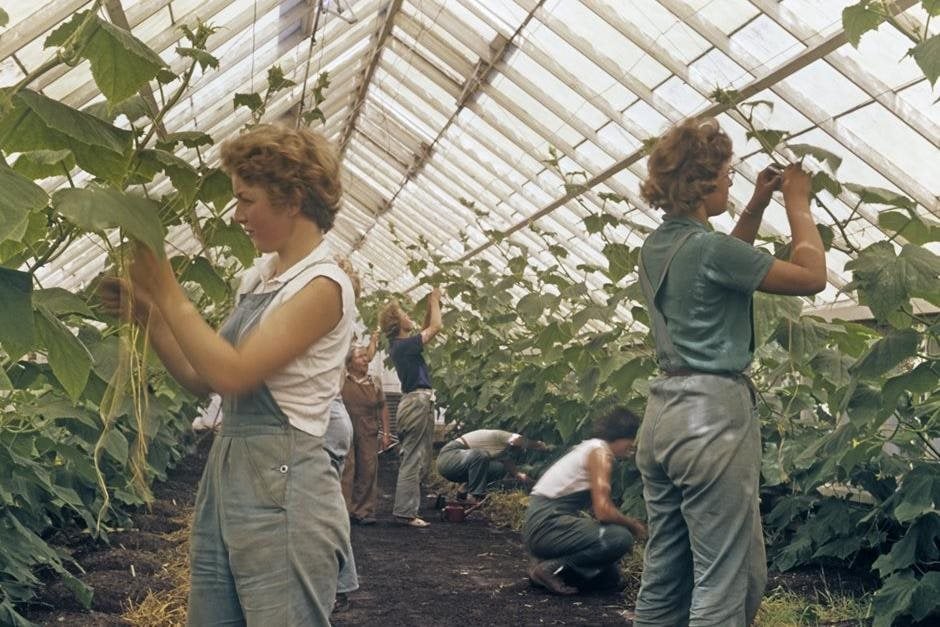 The image in the banner is a photograph of Waterperry Horticultural School students working in the cucumber house, by teacher and photographer Valerie Finnis, c.1950-70. Valerie Finnis / RHS Lindley Collections. Find more inspiration with the RHS Digital Collections.