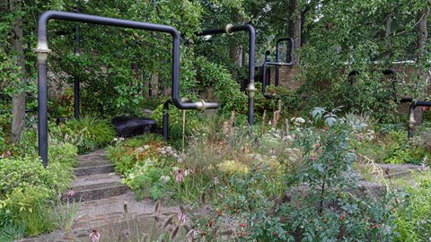 A naturalistic pool surrounded by violet-blue Iris sibirica aids run-off and flood prevention. More than 100 linear metres of metal sculpture traces its way through the garden, echoing the transformation of a city’s industrial past. Its bronze-copper colours and matte and gloss textures contrast with the plants, trees and water.
