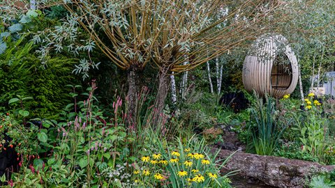 An egg-shaped, steam-bent oak hide, representing soil fertility and health, is suspended over the fast-flowing stream that runs through the whole garden. It provides a place to relax, unwind and observe the natural environment and visiting wildlife.