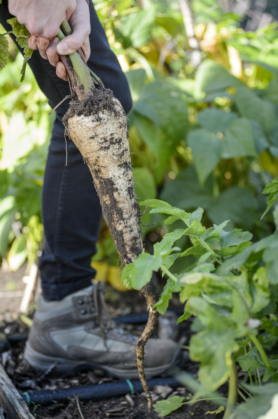 Very uniform, long, slender roots with a smooth white skin. Keeps well over winter in the ground.