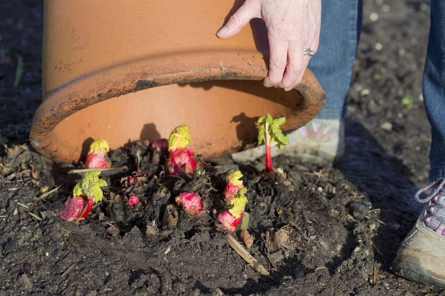 Earlier harvests of sweeter, tender, pale stalks can be produced by covering rhubarb plants with a jar, tall bucket or dustbin in mid-winter, so the stems form in the dark. Choose an early variety, such as ‘Timperley Early’, and only use a strong, healthy plant. Once stalks appear, they will grow quickly so check them regularly. They'll be ready to harvest four to eight weeks after being covered.