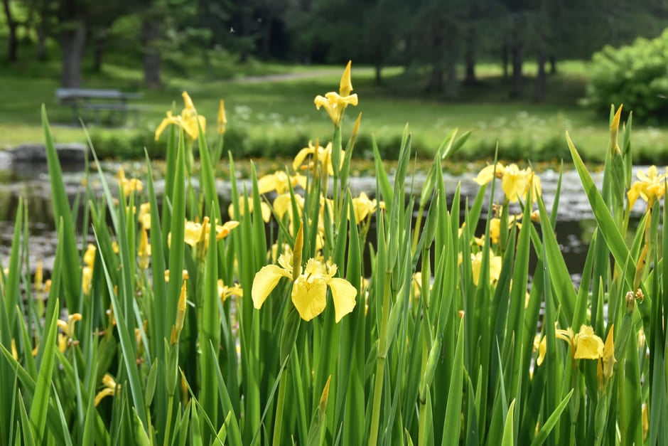 Large garden pond species such as the native Iris pseudacorus (yellow flag iris) may also be too vigorous in small ponds, unless sections are regularly removed.