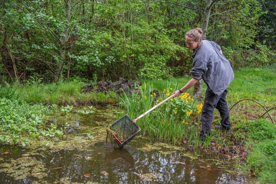 - Cut and thin out weed growth in larger ponds and lakes. Use a long-handled scythe to cut by hand in shallow water. In deeper water use a chain scythe. For large areas, specialist contractors can be employed using weed cutting boats or weed bucket attachments.