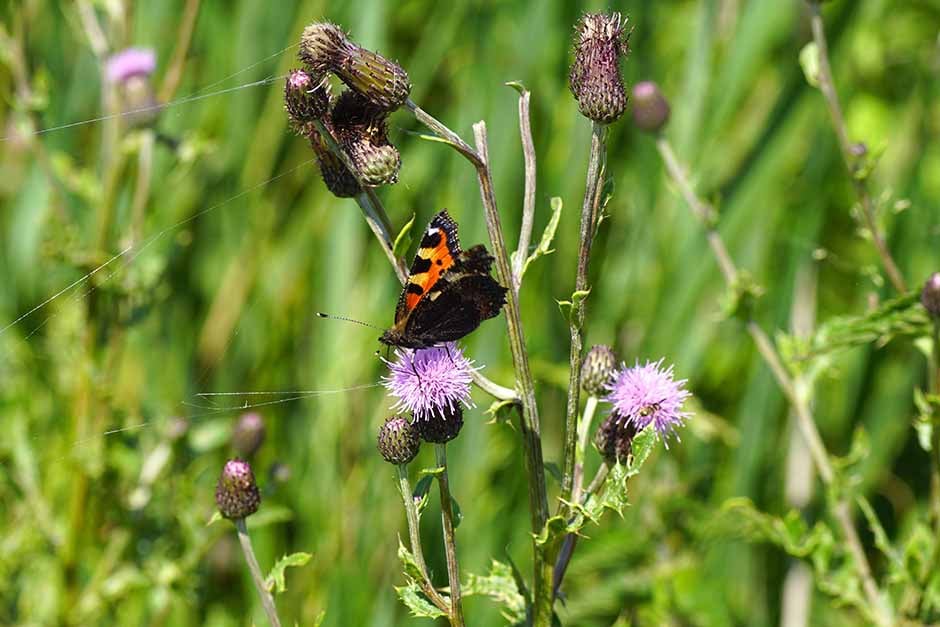 Creeping thistle is a UK , commonly found throughout the country on grassland, waste ground, roadside verges and field margins. It is a valuable plant for wildlife, providing food for a range of invertebrates, including caterpillars of the painted lady butterfly. Its flowers provide nectar for moths and butterflies, including the small tortoiseshell, white letter hairstreak, peacock and meadow brown, and nectar and pollen for bees. Its seeds are also an important food source for a variety of farmland and garden birds, including goldfinches, greenfinches, siskins and lesser redpolls, many of which also use the thistledown for nest building.