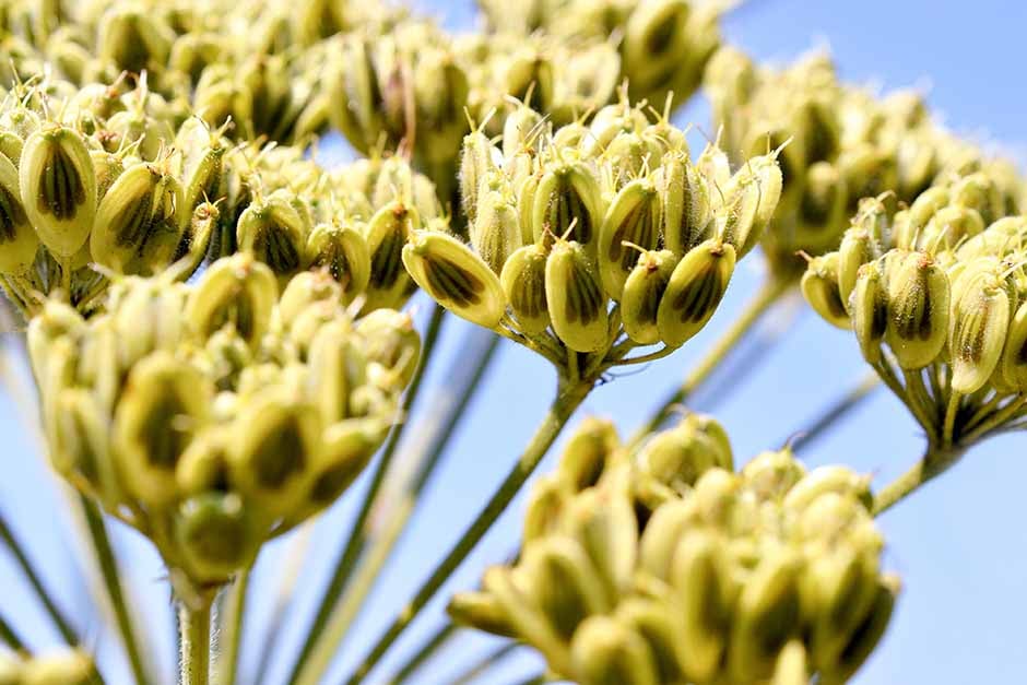 The stems hold umbels (umbrella-like clusters) of upward-facing white flowers; the umbels can be as large as 60cm (2ft) across. Flowers are followed by masses of penny-sized, paper-thin seeds with distinctive dark brown stripes. Underground, giant hogweed grows from a pale, swollen which branches as the plant matures.