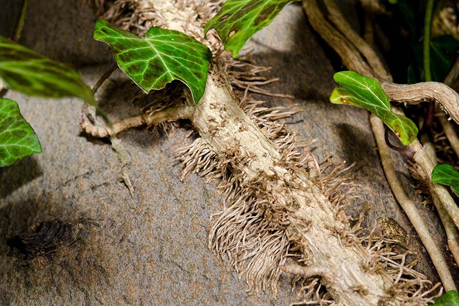 Ivy is a vigorous, evergreen climber that can grow to 30m (98ft). Its purple-green stems become woody with age and produce (aerial) roots, allowing it to attach to tree trunks or walls, or scramble across the ground.