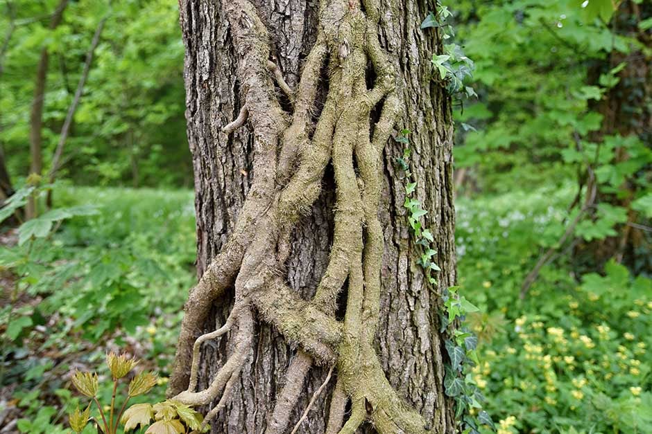 Although ivy on trees is often thought to be a serious problem, endangering the health of even large trees, it isn’t directly harmful. Its aerial roots don’t penetrate tree – they attach to it for support only – and mature, healthy trees are able to cope with some competition at ground level for water and nutrients, and at canopy level for light.