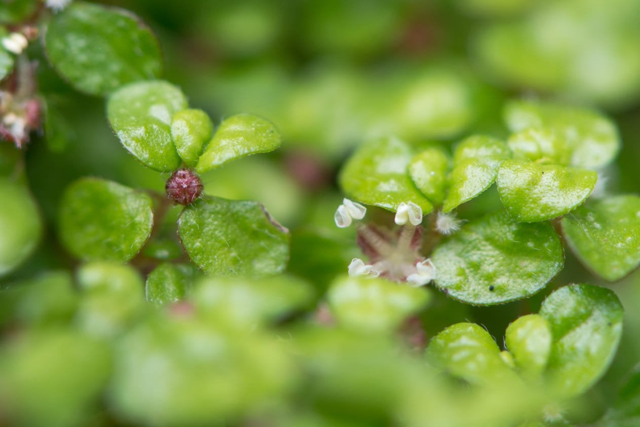 Mind-your-own-business is a creeping evergreen with thin, highly-branched, pale green or pink stems that root along their length. Tiny, rounded green leaves cover the plant to create a dense, tactile, moss-like carpet. The golden-leaved ‘Aurea’ is also grown in gardens. In summer, plants bear minute pinkish-white flowers in the leaf axils. If pollinated, female flowers develop into a shiny, oval fruit containing a single seed.