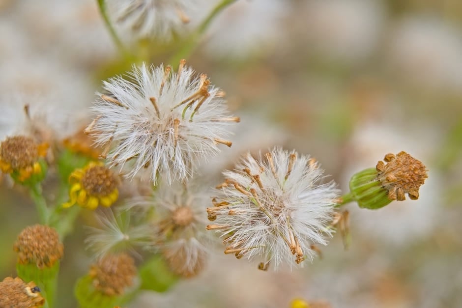 Ragwort plants produce many thousands of seeds, and its seed are adapted to ensure wide dispersal. Those in the centre of the flower head have a thatch of hair attached so they can be transported long distances by the wind, while those around the edge are heavier, with no hairs, and simply drop to the ground ready to germinate after the parent plant dies.