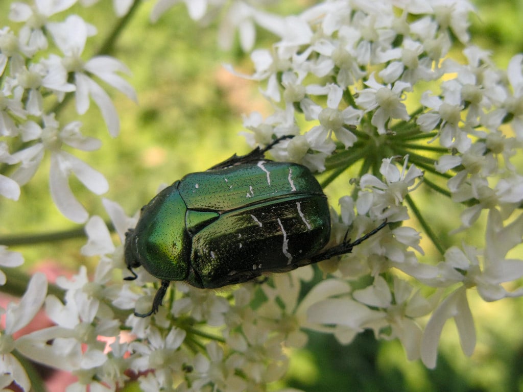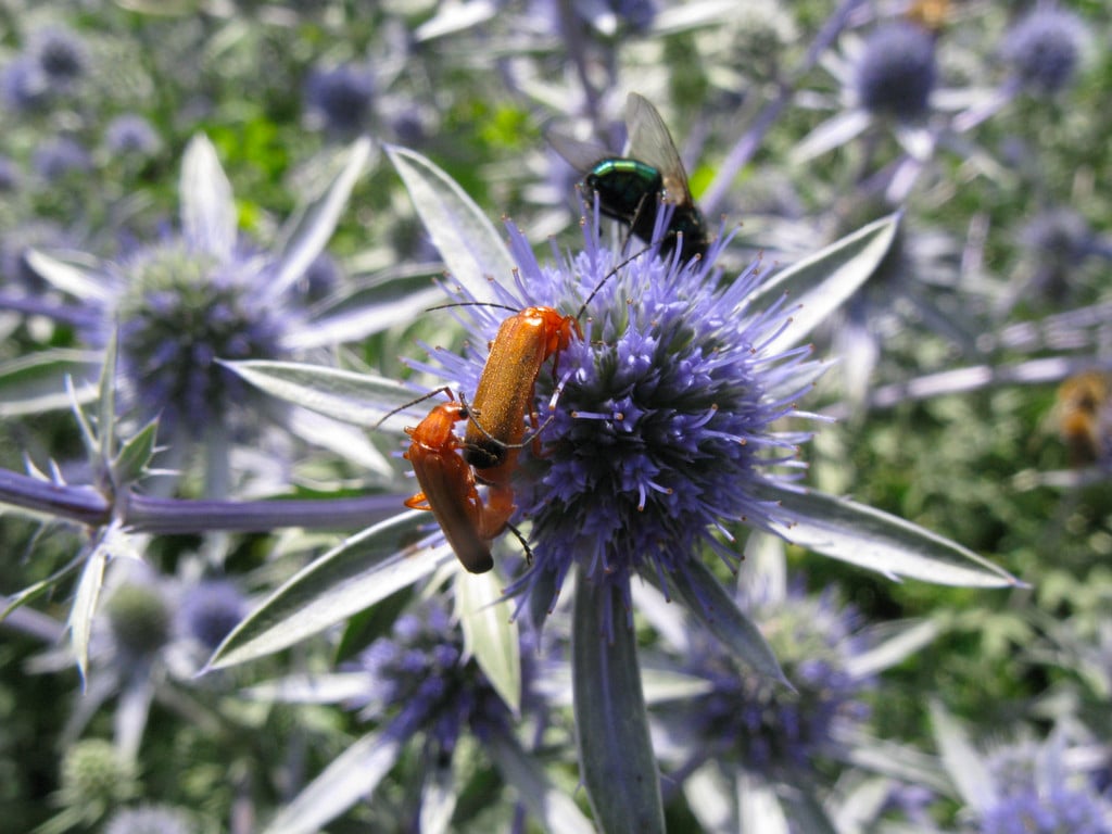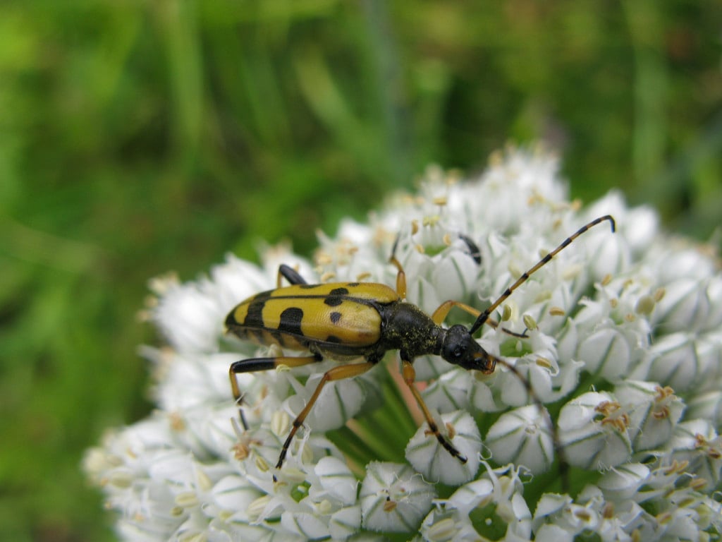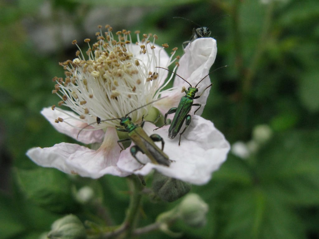 There are approximately 4,500 species of beetle in Britain, they have a very wide range of habits as adults and larvae, some are often found on flowers as adults. These include soldier beetles, which are predatory as larvae, the thick legged flower beetle which feeds in plants stems as a larvae, the colourful rose chafer which feeds on decomposing organic matter as a larva and longhorn beetles most of which are found in dead wood as larvae.