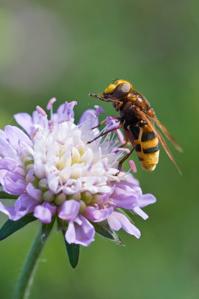 There are more than 6,500 species of true fly (Diptera) in Britain many will visit flowers as adults. The often colourful hoverflies (Syrphidae) are one of the more familiar groups of fly that visit flowers, there are approximately 270 species found in Britain. The adults of many species mimic bees or wasps but none possess a sting. Many species visit flowers and they are important pollinators. The larva of hoverflies have different habits depending on the species, many such as the marmalade hoverfly Episyrphus balteatus are predatory on aphids others have larvae that feed on decomposing organic matter such as the rat tailed maggots, Eristalis species (adults are known as drone flies), others such as the largest British hoverfly the hornet mimic Volucella zonaria are semi-parasitic in wasp and bee nests. A handful of species feed on living plant material including the bulb fliesMerodon equestris, Eumerus strigatus and E. funeralis. The pollinating habits of the 1,000s of other fly species are less well known but are undoubtedly important and many flies are important decomposers, recyclers and predators as larvae, a vital part of healthy ecosystems including gardens.